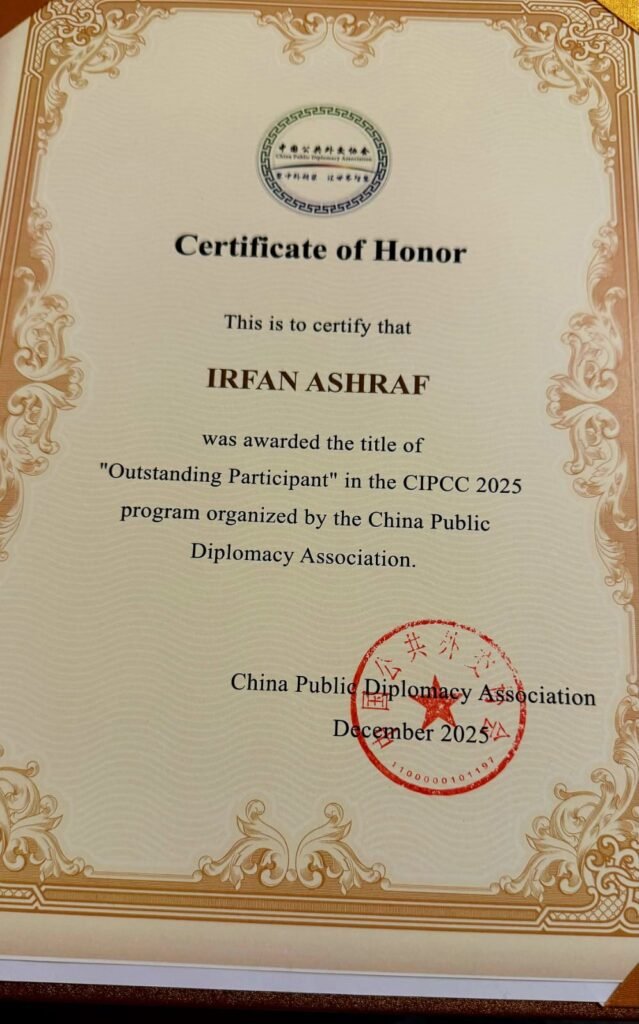 Gallery Dr. Irfan Ashraf Honored with Outstanding Participant Award at CIPCC 2025 Last updated: December 14, 2025 2:35 pm Anum Malik Share SHARE Pictures from the ceremony are attached, offering a few glimpses of Dr. Irfan Ashraf’s tour across China. Subscribe to Our Newsletter Subscribe to our newsletter to get our newest articles instantly! [mc4wp_form] Sign Up For Daily NewsletterBe keep up! Get the latest breaking news delivered straight to your inbox. Email Address Submit By signing up, you agree to our Terms of Use and acknowledge the data practices in our Privacy Policy. You may unsubscribe at any time. Share This Article Email Copy Link Print Previous Article Pride for Pakistan: Dr. Irfan Ashraf Honored with Outstanding Participant Award at CIPCC 2025 Recent Articles Dr. Irfan Ashraf Honored with Outstanding Participant Award at CIPCC 2025 December 14, 2025 Pride for Pakistan: Dr. Irfan Ashraf Honored with Outstanding Participant Award at CIPCC 2025 December 14, 2025 Evolving History of PESS December 11, 2025 China’s Firm Stand on Taiwan: Japan’s Reckless Words Threaten Asia’s Peace December 11, 2025 Pakistan Reiterates Support for China on ‘Zangnan’ as India–China Tensions Resurface December 9, 2025 Show More Popular Articles Budget 2024 of Pakistan: A Pathway to Economic Stability and Prosperity June 23, 2025 Expanding Horizons: Pakistan and Azerbaijan Deepen Bilateral Ties with New Agreements June 23, 2025 Dr. Irfan Ashraf Honored with Outstanding Participant Award at CIPCC 2025 December 14, 2025 Success of Azam-e-Istekhkam Operation: A Prerequisite for Economic Uplift in Pakistan June 23, 2025 Pakistan-China Recent Talks: A New Trajectory in the Strategic Partnership June 23, 2025 Show More